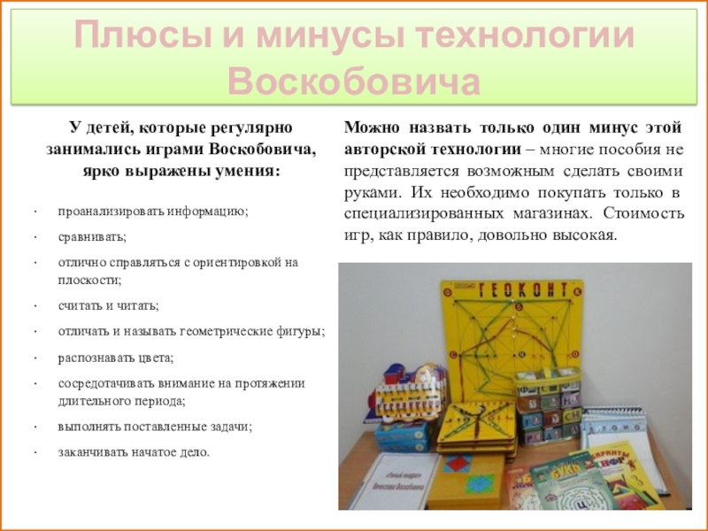 Можно назвать только один минус этой авторской технологии – многие пособия не представляется возможным сделать своими руками. Их необходимо покупать только в специализированных магазинах. Стоимость игр, как правило, довольно высокая.