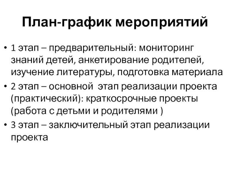 1 этап – предварительный: мониторинг знаний детей, анкетирование родителей, изучение