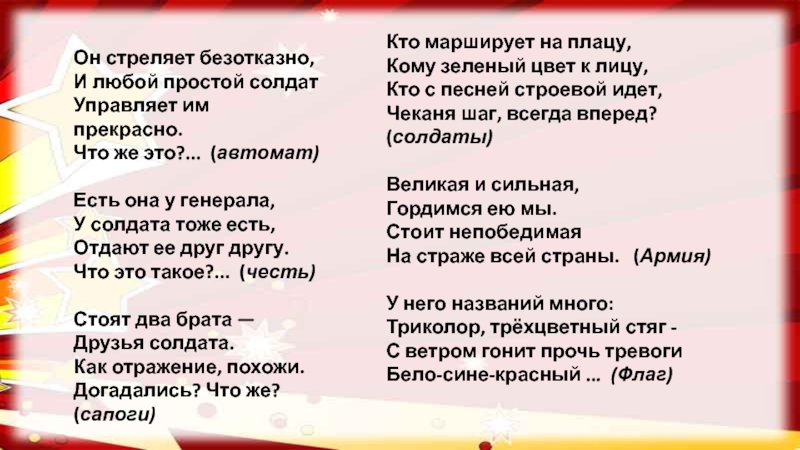 Стоят два брата — Друзья солдата. Как отражение, похожи. Догадались? Что же? (сапоги)