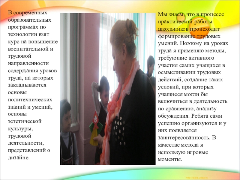 Мы знаем, что в процессе практической работы школьников происходит формирование трудовых умений. Поэтому на уроках труда я применяю методы, требующие активного участия самих учащихся в осмысливании трудовых действий, создание таких условий, при которых учащиеся могли бы включиться в деятельность по сравнению, анализу обсуждения. Ребята сами успешно организуются и у них появляется заинтересованность. В качестве метода я использую игровые моменты.