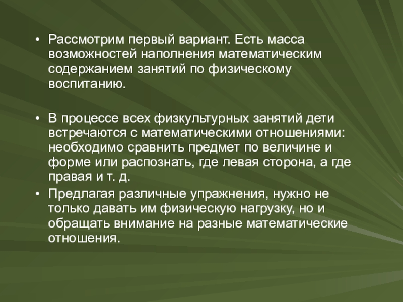 Слайд 6Рассмотрим первый вариант. Есть масса возможностей наполнения математическим содержанием занятий по
