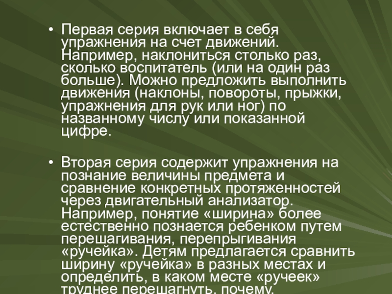 Вторая серия содержит упражнения на познание величины предмета и сравнение конкретных протяженностей через двигательный анализатор. Например, понятие «ширина» более естественно познается ребенком путем перешагивания, перепрыгивания «ручейка». Детям предлагается сравнить ширину «ручейка» в разных местах и определить, в каком месте «ручеек» труднее перешагнуть, почему.