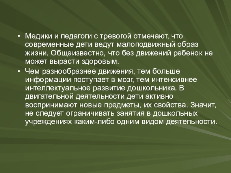 Чем разнообразнее движения, тем больше информации поступает в мозг, тем интенсивнее интеллектуальное развитие дошкольника. В двигательной деятельности дети активно воспринимают новые предметы, их свойства. Значит, не следует ограничивать занятия в дошкольных учреждениях каким-либо одним видом деятельности.