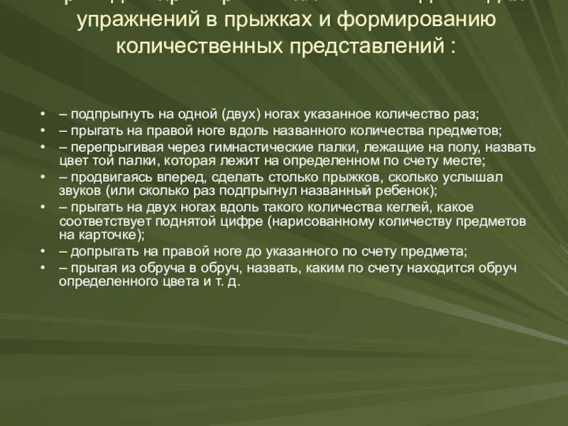 Приведем примеры комплексных заданий для упражнений в прыжках и формированию количественных