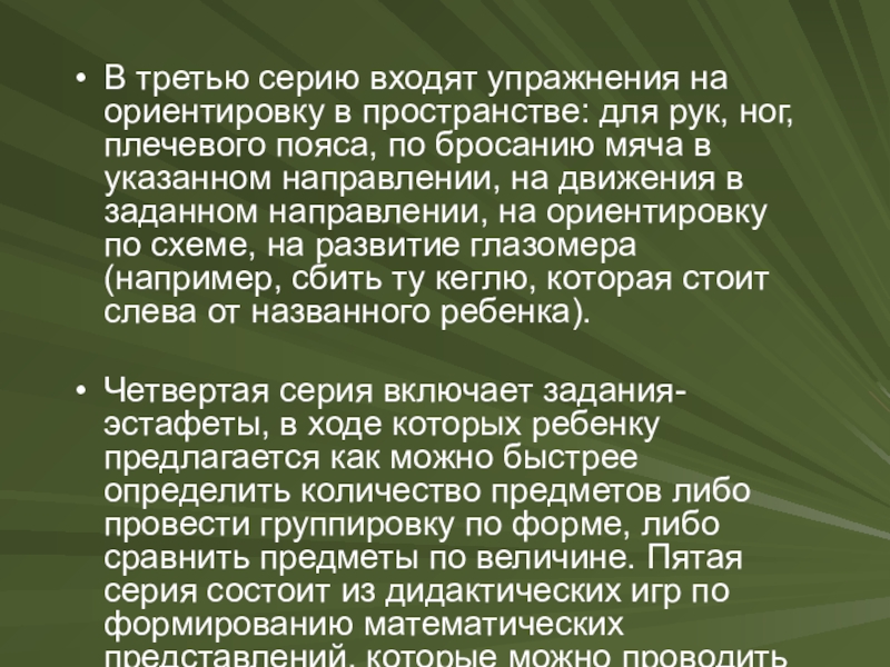 Четвертая серия включает задания-эстафеты, в ходе которых ребенку предлагается как можно быстрее определить количество предметов либо провести группировку по форме, либо сравнить предметы по величине. Пятая серия состоит из дидактических игр по формированию математических представлений, которые можно проводить в подвижной форме.
