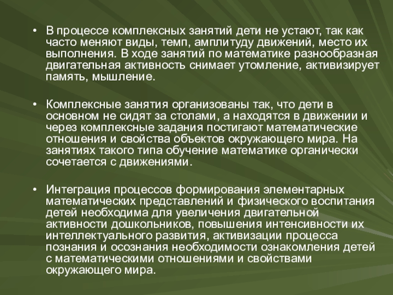 Комплексные занятия организованы так, что дети в основном не сидят за столами, а находятся в движении и через комплексные задания постигают математические отношения и свойства объектов окружающего мира. На занятиях такого типа обучение математике органически сочетается с движениями.
