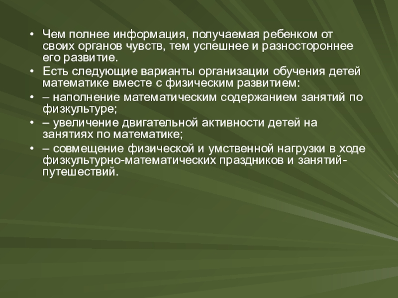 Слайд 5Чем полнее информация, получаемая ребенком от своих органов чувств, тем успешнее