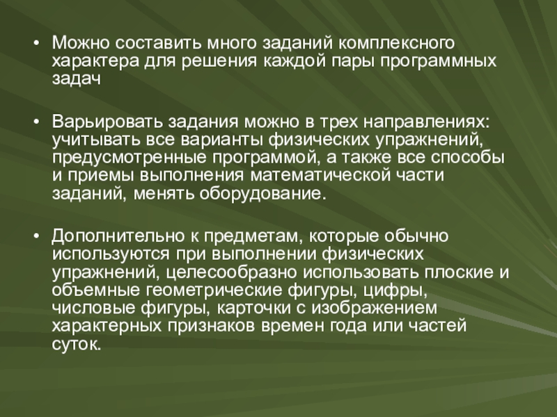 Варьировать задания можно в трех направлениях: учитывать все варианты физических упражнений, предусмотренные программой, а также все способы и приемы выполнения математической части заданий, менять оборудование.