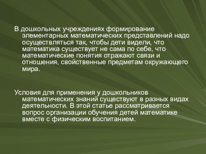 Условия для применения у дошкольников математических знаний существуют в разных видах деятельности. В этой статье рассматривается вопрос организации обучения детей математике вместе с физическим воспитанием.