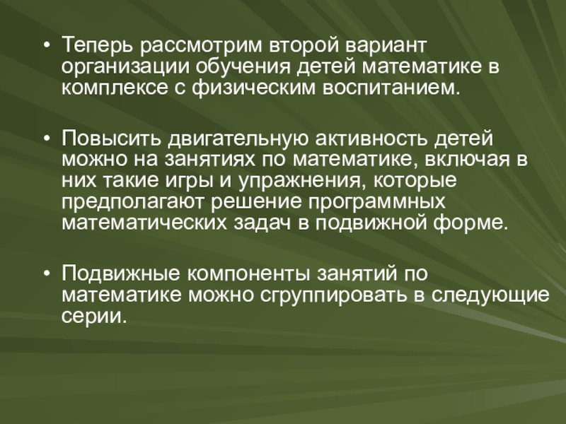 Есть следующие варианты организации обучения детей математике вместе с физическим развитием: