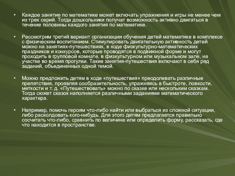 Слайд 13Каждое занятие по математике может включать упражнения и игры не менее