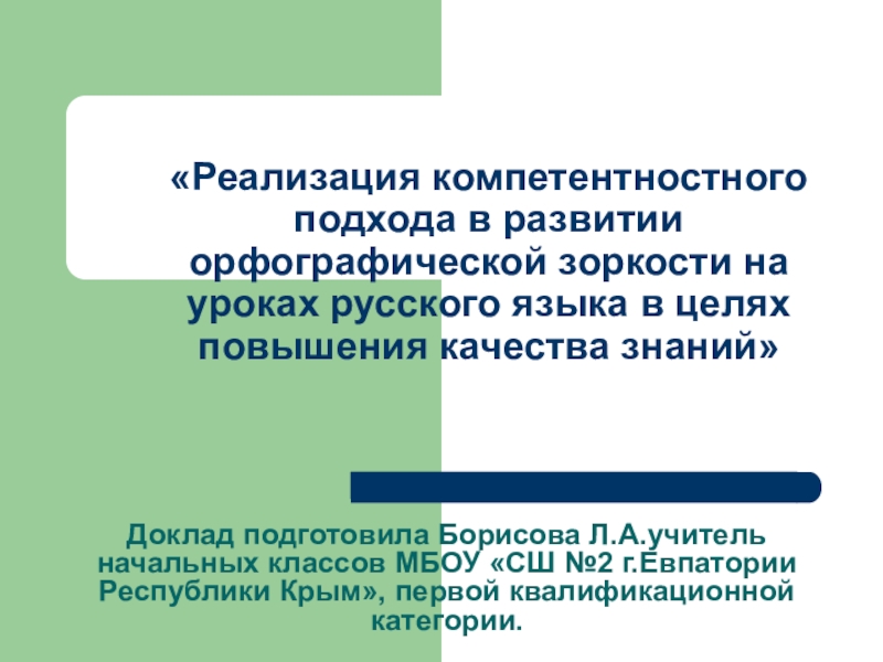 Слайд 1«Реализация компетентностного подхода в развитии орфографической зоркости на уроках русского языка