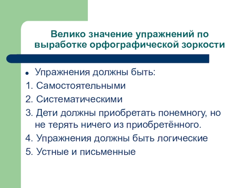 Слайд 7Велико значение упражнений по выработке орфографической зоркости