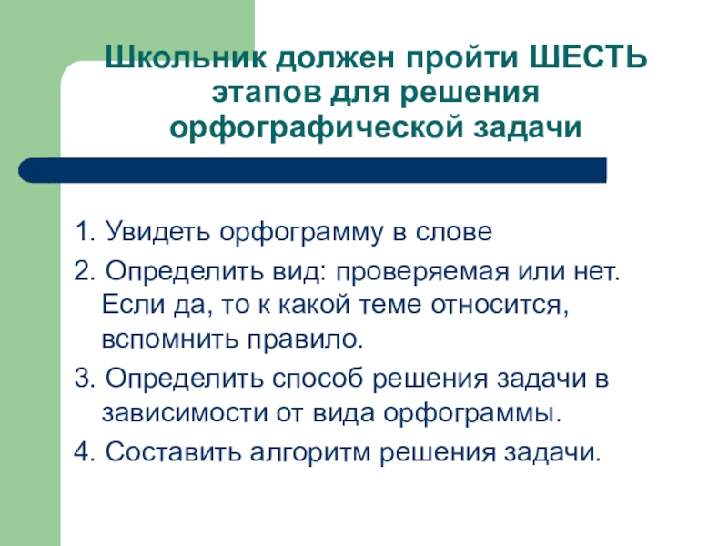 Слайд 3Школьник должен пройти ШЕСТЬ этапов для решения орфографической задачи