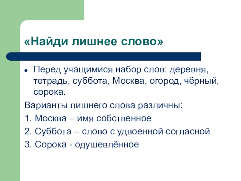 Перед учащимися набор слов: деревня, тетрадь, суббота, Москва, огород,
