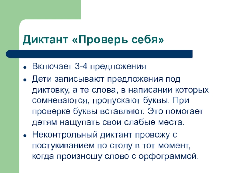 Неконтрольный диктант провожу с постукиванием по столу в тот момент, когда произношу слово с орфограммой.