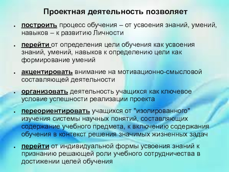 Проектная деятельность позволяет построить процесс обучения – от усвоения знаний, умений, навыков – к развитию Личностиперейти от