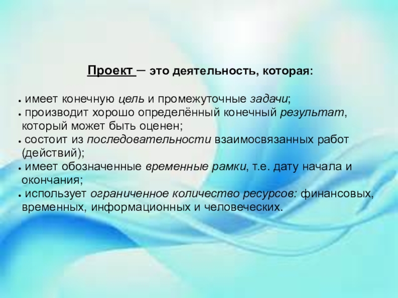 Проект – это деятельность, которая: имеет конечную цель и промежуточные задачи; производит хорошо определённый конечный результат, который может быть оценен; состоит из последовательности взаимосвязанных работ (действий); имеет обозначенные временные рамки, т.е. дату начала и окончания; использует