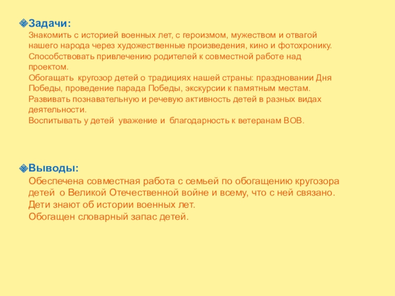 Обеспечена совместная работа с семьей по обогащению кругозора детей о Великой Отечественной войне и всему, что с ней связано.