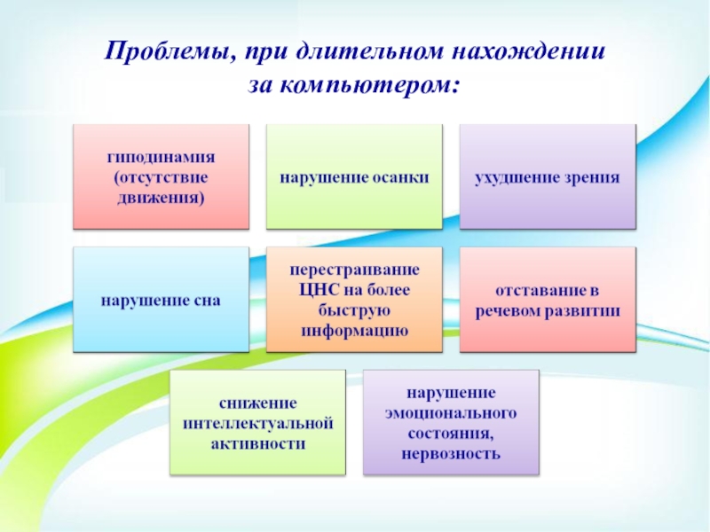Слайд 12Проблемы, при длительном нахождении за компьютером: