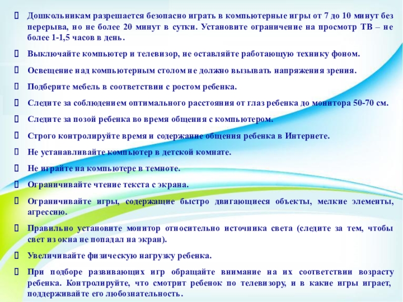 Слайд 13Дошкольникам разрешается безопасно играть в компьютерные игры от 7 до 10