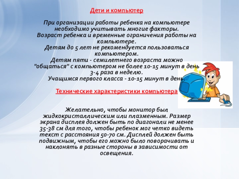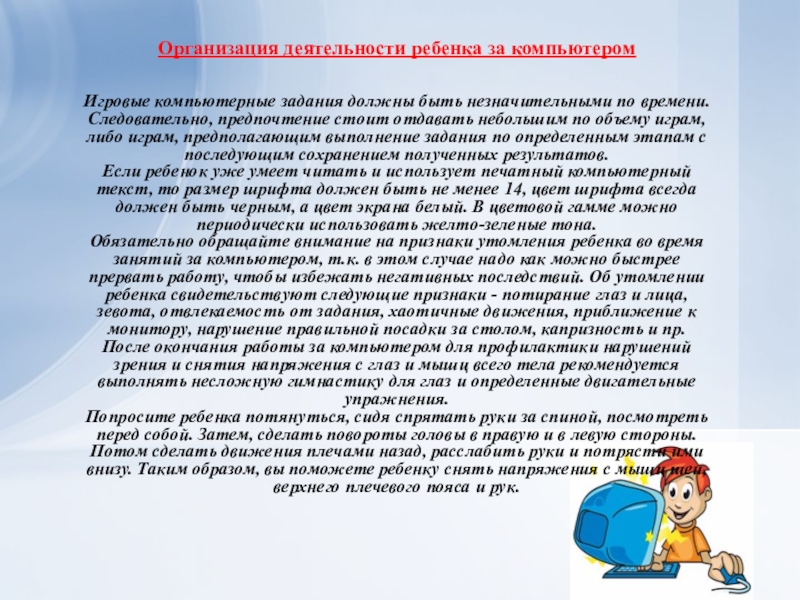 При организации работы ребенка на компьютере необходимо учитывать многие