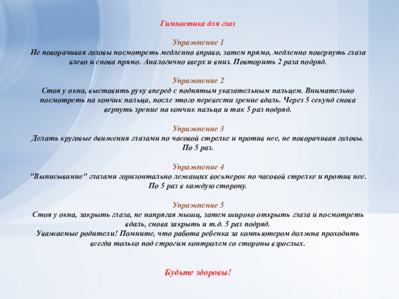 После окончания работы за компьютером для профилактики нарушений зрения и снятия напряжения с глаз и мышц всего тела рекомендуется выполнять несложную гимнастику для глаз и определенные двигательные упражнения.
