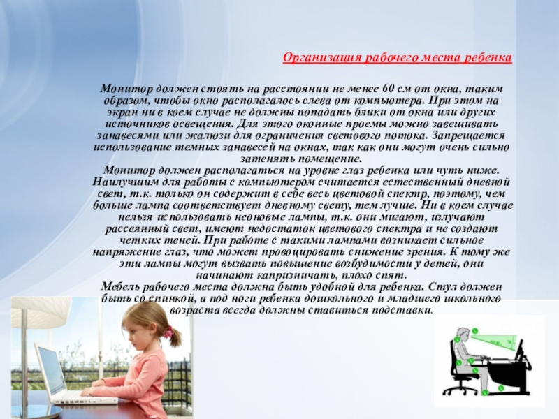 Монитор должен располагаться на уровне глаз ребенка или чуть ниже. Наилучшим для работы с компьютером считается естественный дневной свет, т.к. только он содержит в себе весь цветовой спектр, поэтому, чем больше лампа соответствует дневному свету, тем лучше. Ни в коем случае нельзя использовать неоновые лампы, т.к. они мигают, излучают рассеянный свет, имеют недостаток цветового спектра и не создают четких теней. При работе с такими лампами возникает сильное напряжение глаз, что может провоцировать снижение зрения. К тому же эти лампы могут вызвать повышение возбудимости у детей, они начинают капризничать, плохо спят.