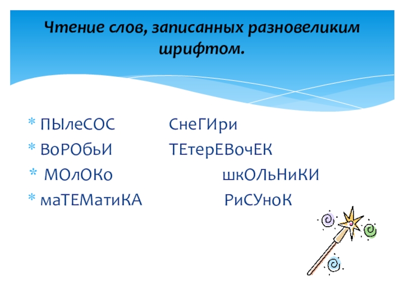 Чтение слов, записанных разновеликим шрифтом.