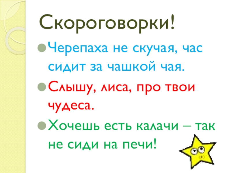 Скороговорки!Черепаха не скучая, час сидит за чашкой чая.Слышу, лиса, про твои чудеса.Хочешь есть калачи – так не