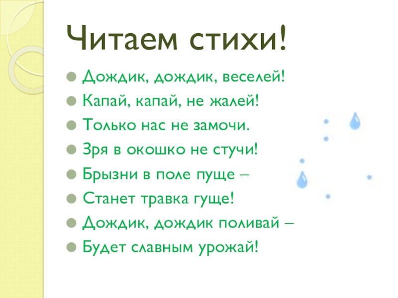 Читаем стихи!Дождик, дождик, веселей!Капай, капай, не жалей!Только нас не замочи.Зря в окошко не стучи!Брызни в поле пуще