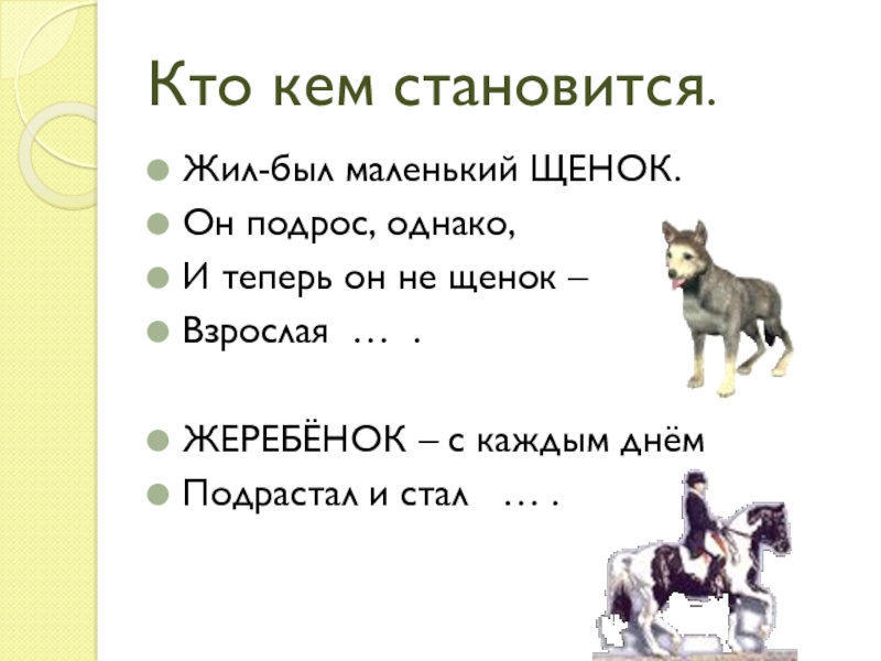 Кто кем становится.Жил-был маленький ЩЕНОК.Он подрос, однако,И теперь он не щенок –Взрослая … .ЖЕРЕБЁНОК – с каждым