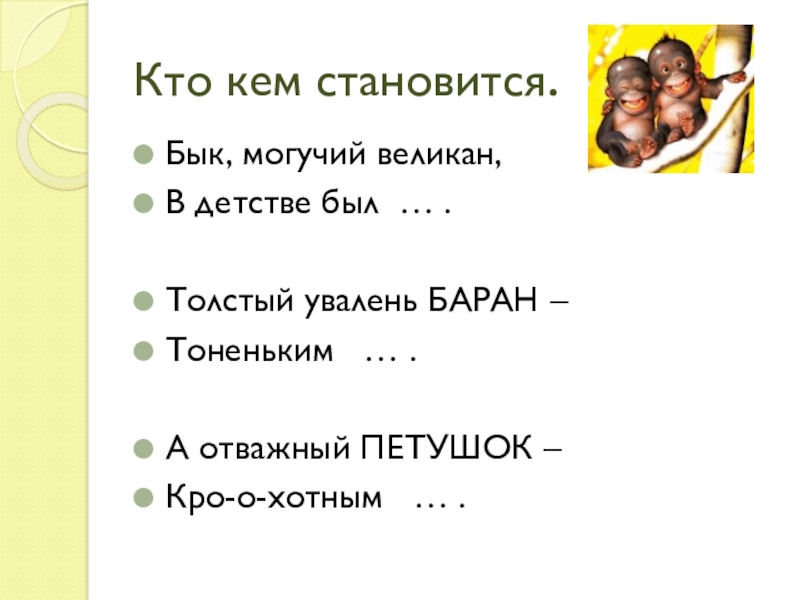 Кто кем становится.Бык, могучий великан,В детстве был … .Толстый увалень БАРАН –Тоненьким  … .А отважный ПЕТУШОК