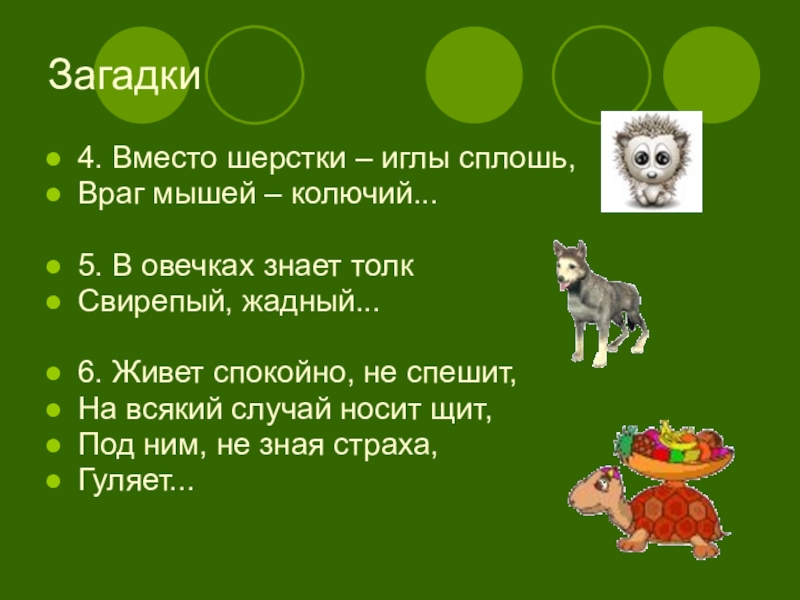 Загадки4. Вместо шерстки – иглы сплошь,Враг мышей – колючий... 5. В овечках знает толкСвирепый, жадный... 6. Живет