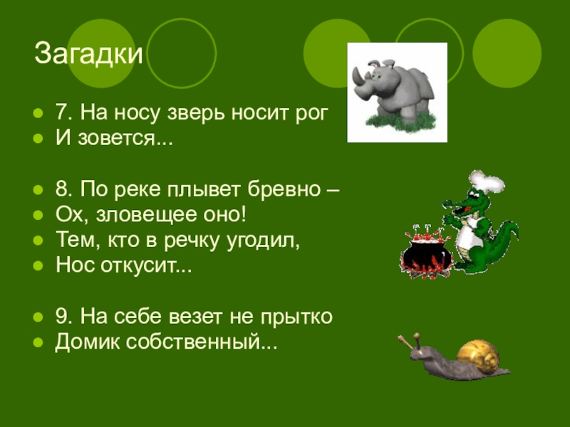 Загадки7. На носу зверь носит рогИ зовется... 8. По реке плывет бревно –Ох, зловещее оно!Тем, кто в