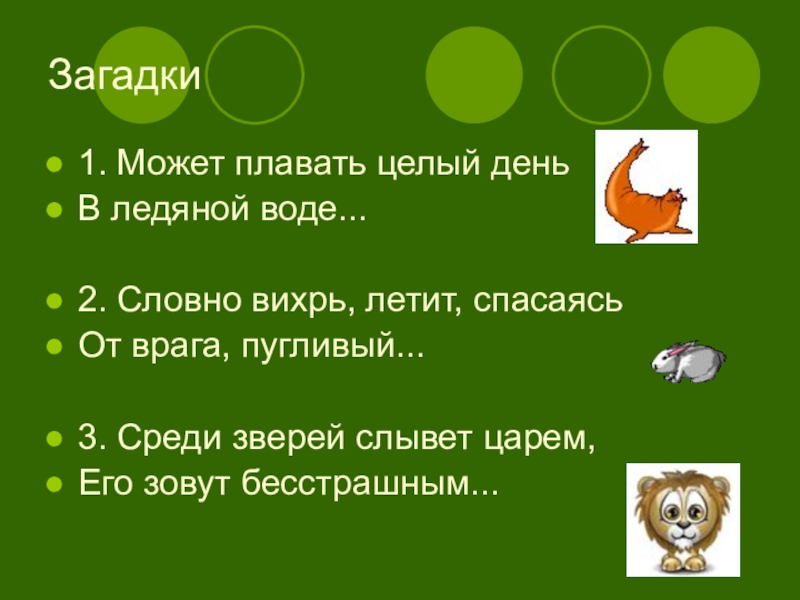 Загадки1. Может плавать целый деньВ ледяной воде...2. Словно вихрь, летит, спасаясьОт врага, пугливый...3. Среди зверей слывет царем,Его