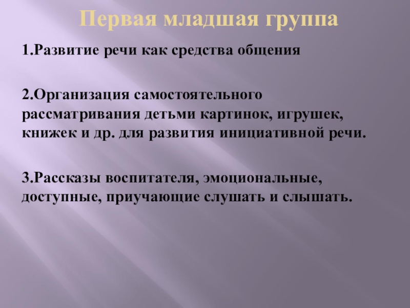 Первая младшая группа1.Развитие речи как средства общения 2.Организация самостоятельного рассматривания детьми картинок, игрушек, книжек и др. для