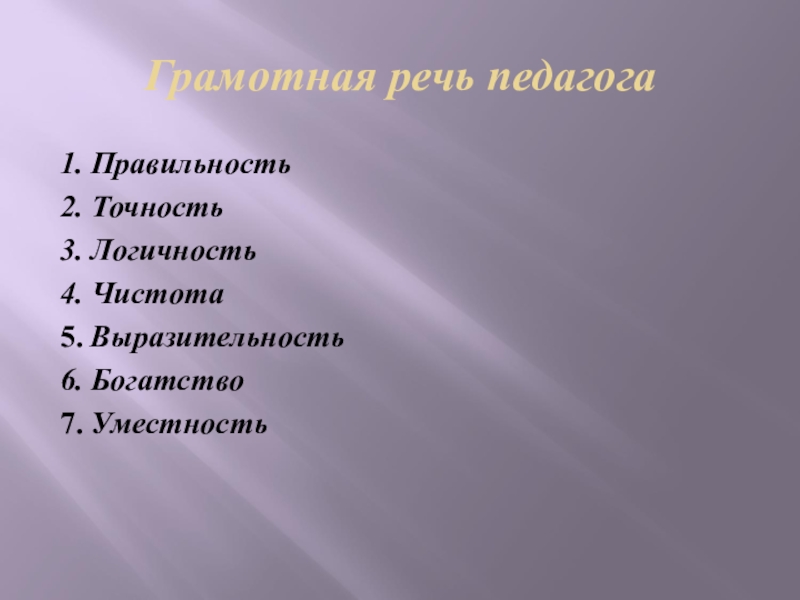 Грамотная речь педагога1. Правильность2. Точность3. Логичность4. Чистота5. Выразительность6. Богатство7. Уместность