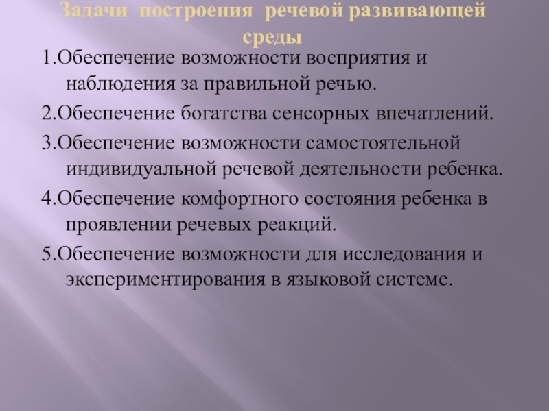 Задачи построения речевой развивающей среды 1.Обеспечение возможности восприятия и наблюдения за правильной речью.2.Обеспечение богатства сенсорных впечатлений.3.Обеспечение возможности