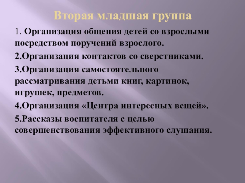 Вторая младшая группа1. Организация общения детей со взрослыми посредством поручений взрослого.2.Организация контактов со сверстниками.3.Организация самостоятельного рассматривания детьми