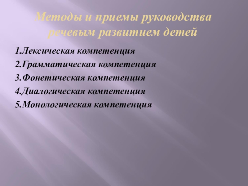 Методы и приемы руководства речевым развитием детей1.Лексическая компетенция2.Грамматическая компетенция3.Фонетическая компетенция4.Диалогическая компетенция5.Монологическая компетенция
