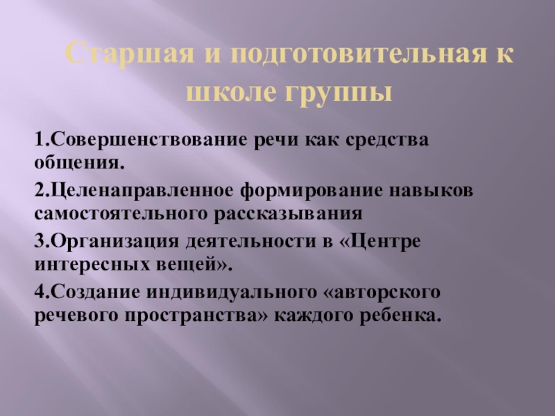 Старшая и подготовительная к школе группы1.Совершенствование речи как средства общения.2.Целенаправленное формирование навыков самостоятельного рассказывания3.Организация деятельности в «Центре