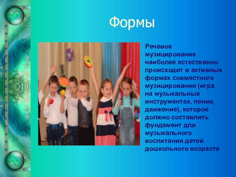 совместного музицирования (игра на музыкальных инструментах, пение, движение), которое должно составлять фундамент для музыкального воспитания детей дошкольного возраста