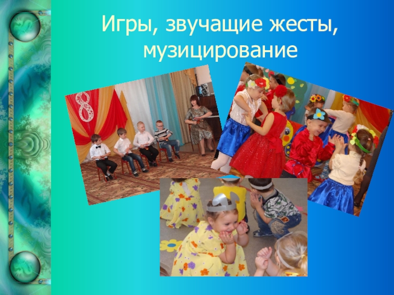 Слайд 13Игры, звучащие жесты, музицирование