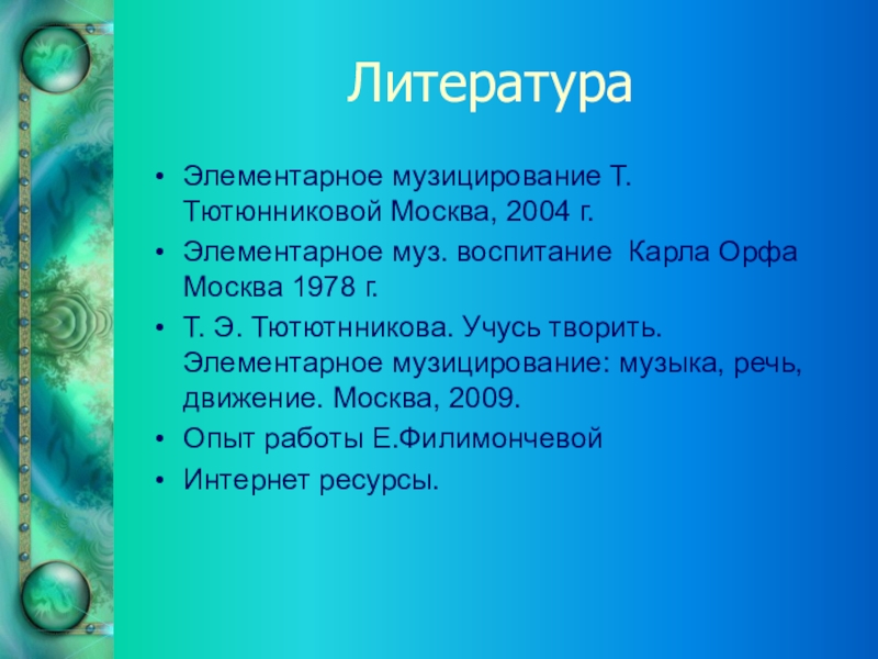 Т. Э. Тютютнникова. Учусь творить. Элементарное музицирование: музыка, речь, движение. Москва, 2009.