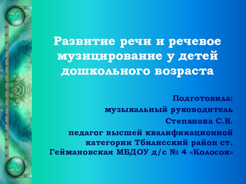 высшей квалификационной категории Тбилисский район ст.Геймановская МБДОУ д/с № 4 «Колосок»