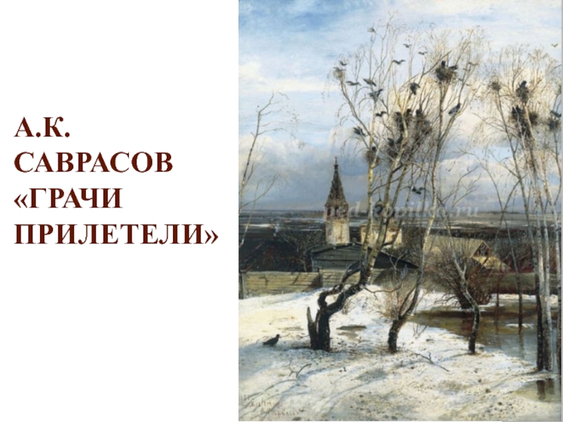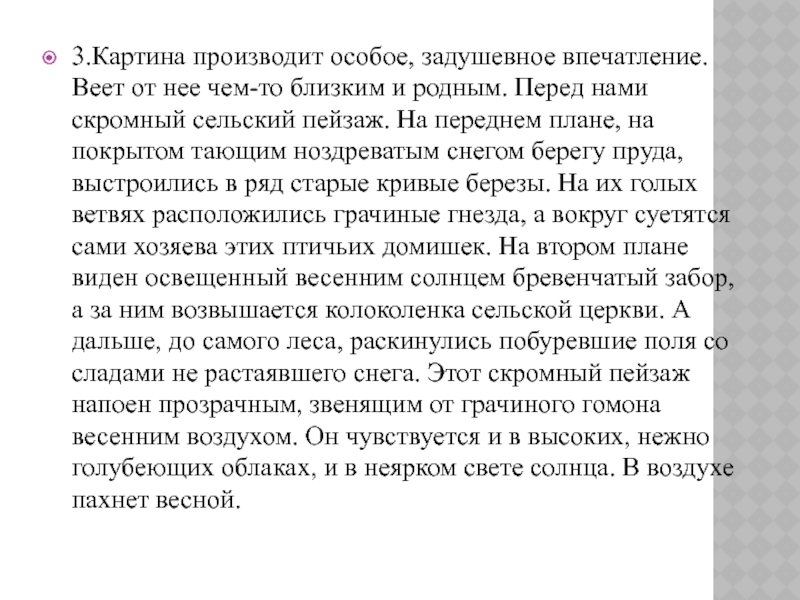 родным. Перед нами скромный сельский пейзаж. На переднем плане, на покрытом тающим ноздреватым снегом берегу пруда, выстроились в ряд старые кривые березы. На их голых ветвях расположились грачиные гнезда, а вокруг суетятся сами хозяева этих птичьих домишек. На втором плане виден освещенный весенним солнцем бревенчатый забор, а за ним возвышается колоколенка сельской церкви. А дальше, до самого леса, раскинулись побуревшие поля со сладами не растаявшего снега. Этот скромный пейзаж напоен прозрачным, звенящим от грачиного гомона весенним воздухом. Он чувствуется и в высоких, нежно голубеющих облаках, и в неярком свете солнца. В воздухе пахнет весной.