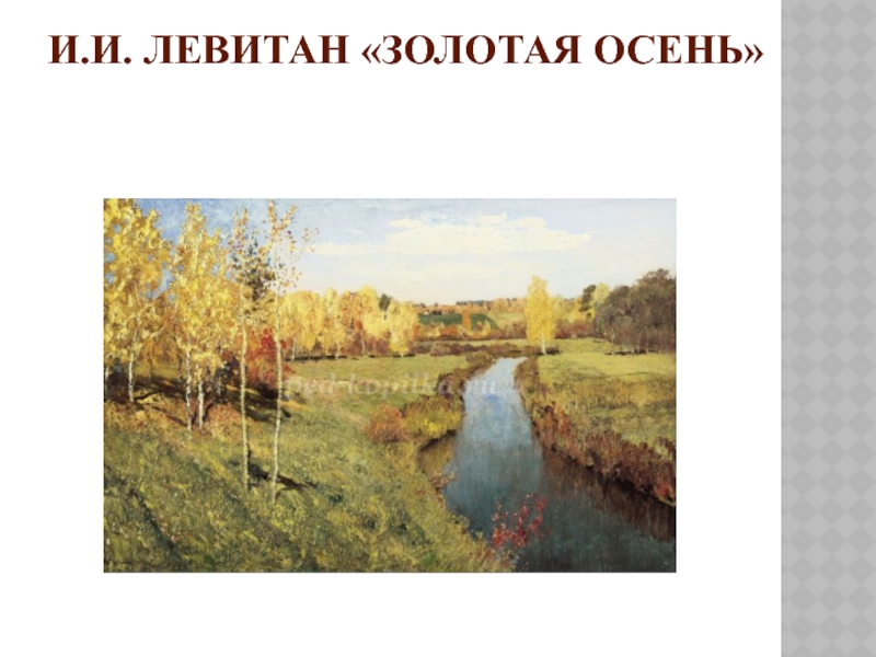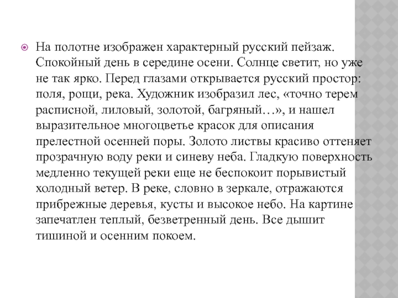 Слайд 21На полотне изображен характерный русский пейзаж. Спокойный день в середине осени.