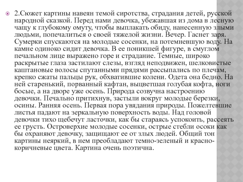 нами девочка, убежавшая из дома в лесную чащу к глубокому омуту, чтобы выплакать обиду, нанесенную злыми людьми, попечалиться о своей тяжелой жизни. Вечер. Гаснет заря. Сумерки спускаются на молодые сосенки, на потемневшую воду. На камне одиноко сидит девочка. В ее поникшей фигуре, в смуглом печальном лице выражено горе и страдание. Темные, широко раскрытые глаза застилают слезы, взгляд неподвижен, шелковистые каштановые волосы спутанными прядями рассыпались по плечам, крепко сжаты пальцы рук, обхватившие колени. Одета она бедно. На ней старенький, порванный кафтан, выцветшая голубая кофта, ноги босые, а на дворе уже осень. Природа созвучна настроению девочки. Печально притихнув, застыли вокруг молодые березки, осины. Ранняя осень. Первая пора увядания природы. Пожелтевшие листья падают на зеркальную поверхность воды. Над головой девочки тихо щебечут ласточки, как бы стараясь успокоить, рассеять ее грусть. Островерхие молодые сосенки, острые стебли осоки как бы охраняют девочку, защищают ее от злых людей. Общий тон картины неяркий, в нем преобладают темно-зеленый и красно-коричневые цвета. Картина очень поэтична.