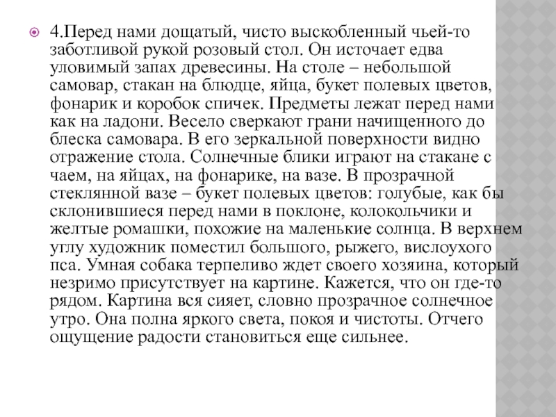 Слайд 274.Перед нами дощатый, чисто выскобленный чьей-то заботливой рукой розовый стол. Он